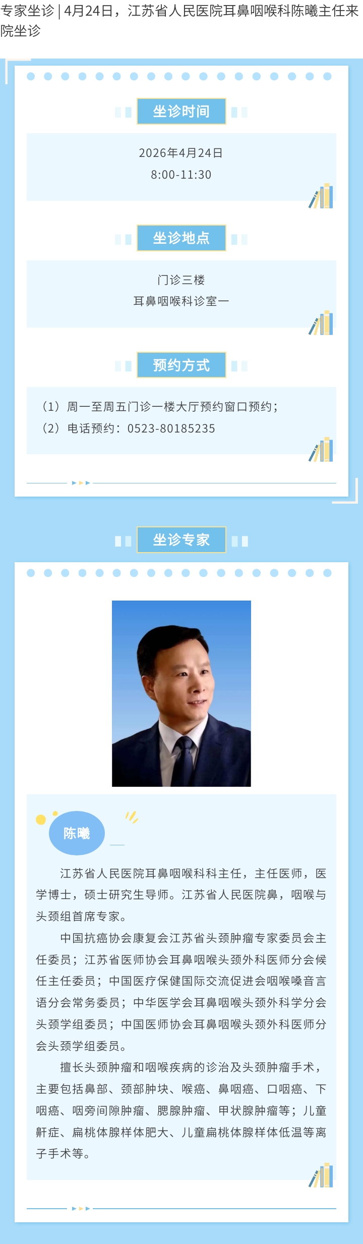 4月24日,江苏省人民医院耳鼻咽喉科陈曦主任来院坐诊 ...