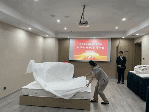 本次竞赛共设置四个环节,包括仪容仪表展示、标准中式铺床、知识问答以及创意折叠展示。为确保竞赛的公正性和专业性,比赛特别设置了五名评委、一名计时员、一名记分员以及一名监督员,共同负责比赛的评判和监督工作。